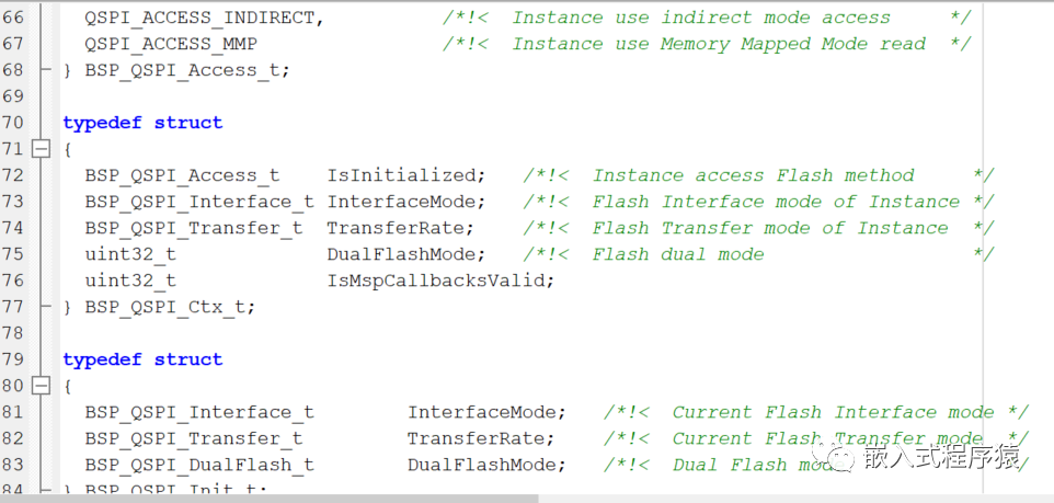 从手册可以知道分为间接模式,状态轮询模式,内存映射模式,那么我们的驱动就要能够分别支持这三种模式。在stm32h743i_eval_qspi.h里面定义这些模式和其他数据类型。这些可以参考官方的定义