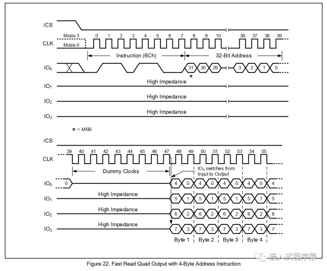 从时序图可以看到指令单线,地址单线,数据4线即 1-1-4模式。0xEC留给大家去联系实现。