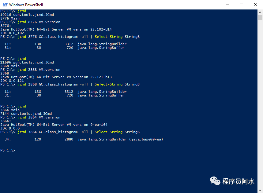 然后通过jdk自带的jcmd工具,分别针对Java 8 Update 102、Java 8 Update 121、OpenJDK 9.0 ea+164三个版本进行测试,结果如下: