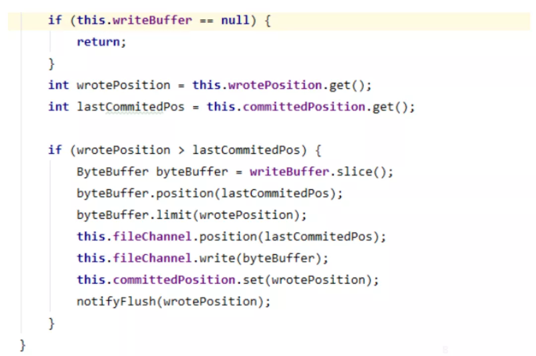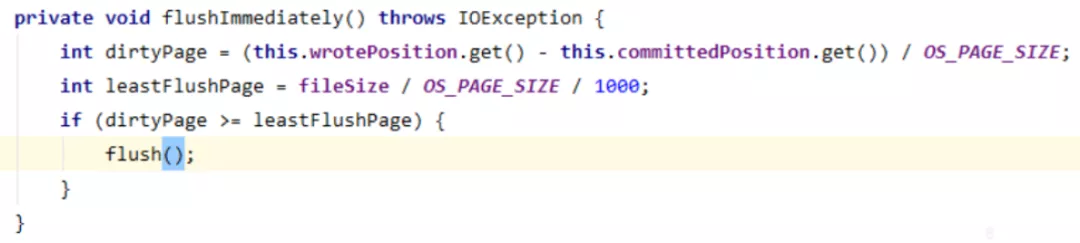 每个JVM进程实际操作的地址都是虚拟内存,而虚拟内存实际会通过MMU与物理内存地址关联起来。当我们操作一个文件时,如果文件内容没有加载至物理内存,会产生一个硬中断(major page fault),若物理内存存在了,虚拟内存没有与物理内存关联,会产生一次软中断(minor page fault),而Linux中断关联,是以page的维度来发生关联的,一个page是4kb。因此我们在写入文件刷盘时,就可以充分利用中断的机制,以page的维度来刷盘,当达到一定的脏页后,我们再发生flush操作,减少硬中断的产生,代码如下: