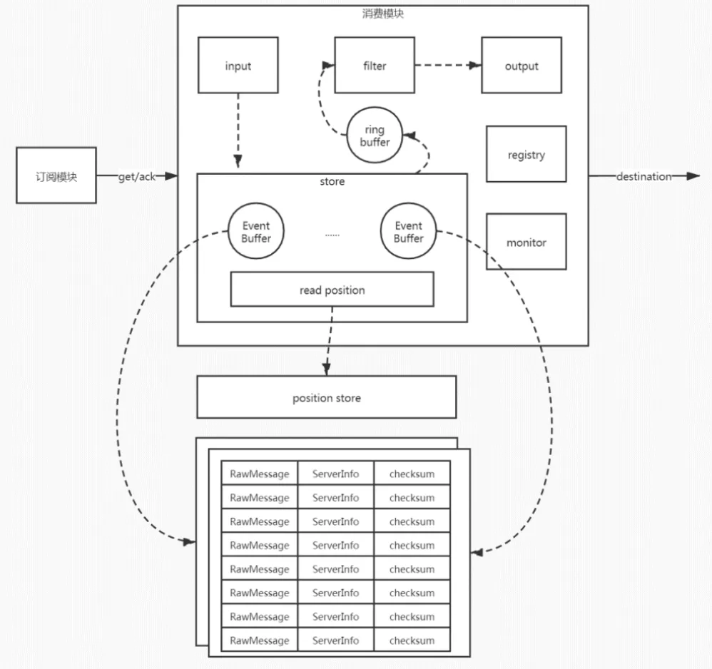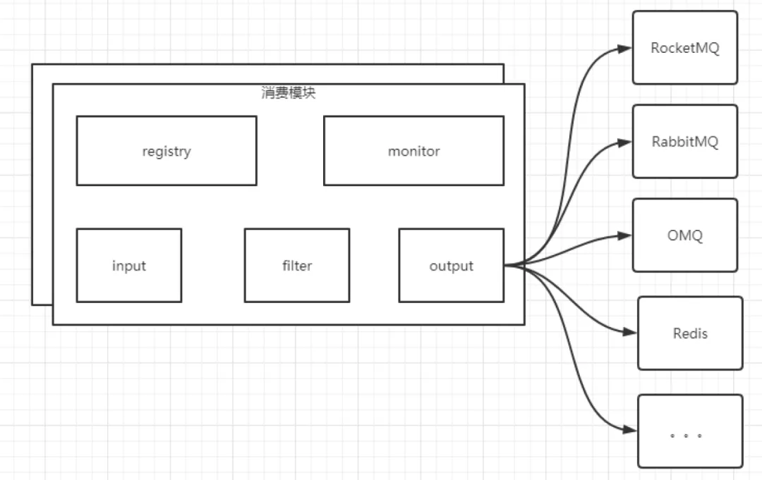 消费模块包含input(与订阅模块交互)、filter(过滤)、output(输出)、registry(注册)、monitor(监控)