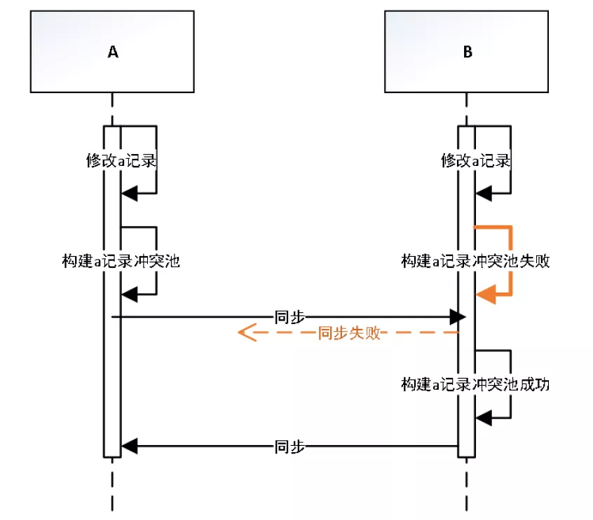 从上图可以看出,如果某端由于延迟或者同步宕机造成构建冲突池失败,就会造成数据不一致。
