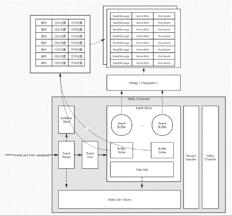 如上图EventStore模块,通过MMap文件队列,每个MMap文件对应一个索引文件。后续可以通过索引二分查询定位至具体文件位置。写入MMap文件队列为顺序写入。
