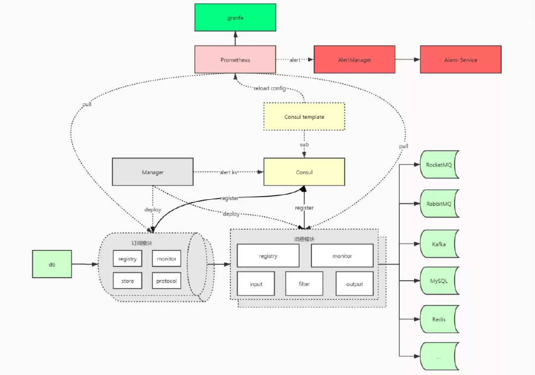 注册中心,负责完成订阅、消费节点的服务自动注册,与prometheus完成监控自动发现,并于Manager模块完成kv告警指标存储