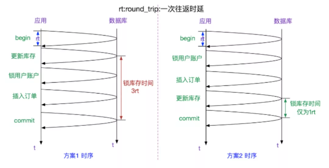同样是一个事务的操作,只是转换一下顺序,库存的行锁就减少了锁等待的时间。间接的提高了整体的操作效率。