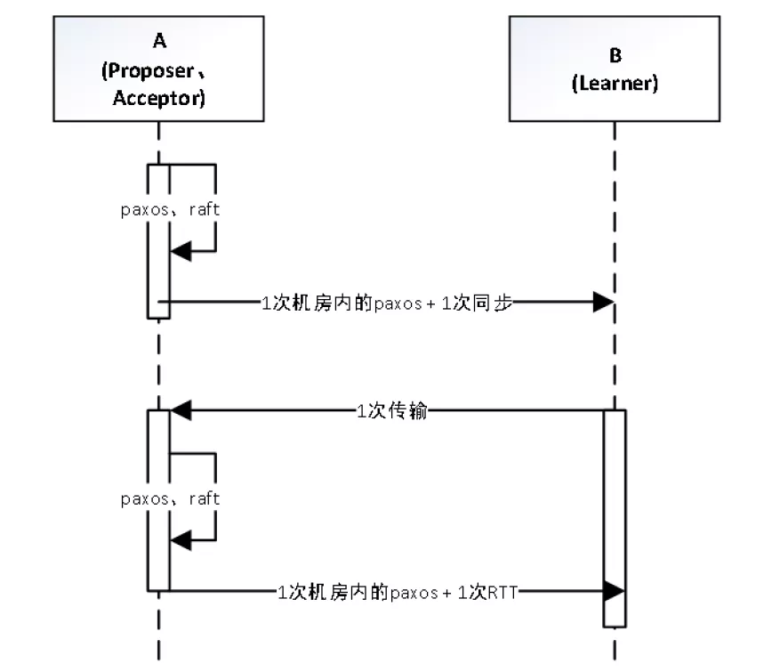 - 流程图1中 A地包含共识算法中(paxos)的 Proposer、Acceptor,B地中只包含共识算法中的Learner,假设A地写入,从图中可得数据将做 一次Paxos时间 + 一次网络传输时间