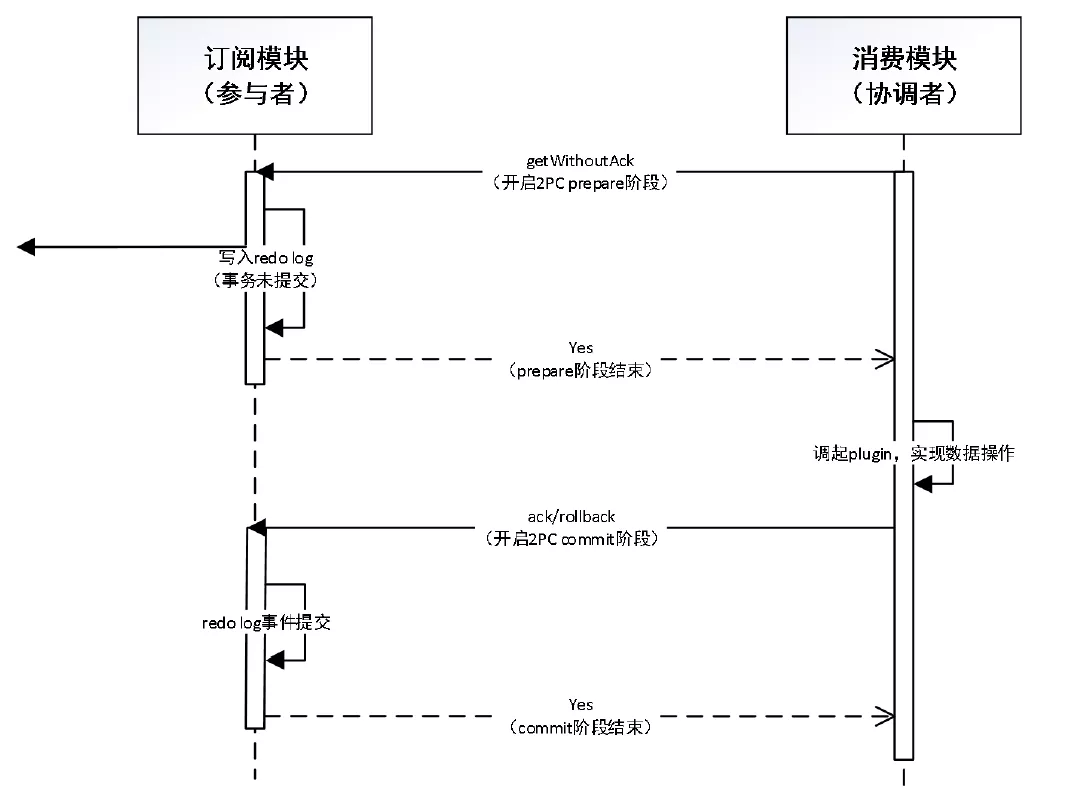 消费模块(协调者)无论写入目标成功失败,都会返回给订阅模块(参与者,ack/rollback),订阅模块根据协调者的返回结果,决定内存中的redo log数据commit还是rollback,若commit,将该数据持久化