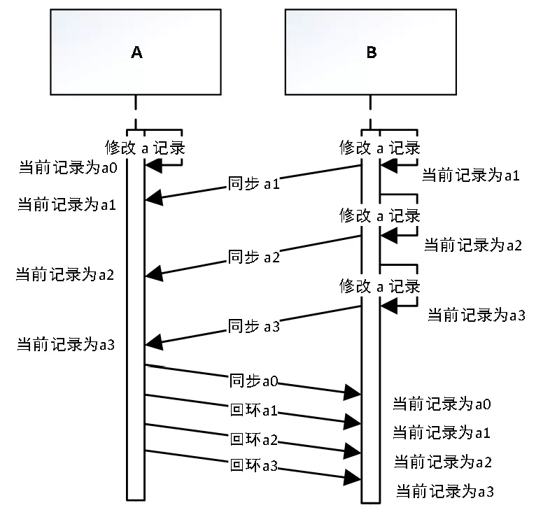 从上述3个时序图可以得出,单向回环会保证数据最终一致性(图1),但是当某地同步延迟或宕机场景下,有可能造成数据的版本交替现象(图2)、版本丢失(图3)情况,但是最终两地数据一定保证一致。