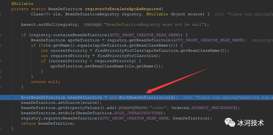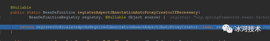 在AopConfigUtils类的registerAspectJAnnotationAutoProxyCreatorIfNecessary()方法中,直接调用了重载的registerAspectJAnnotationAutoProxyCreatorIfNecessary()方法,我们继续跟代码,如下所示。