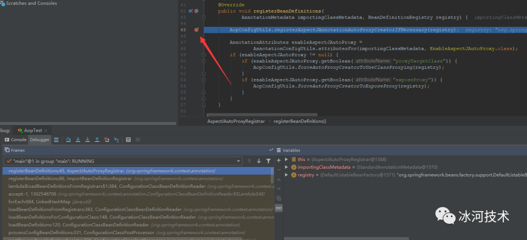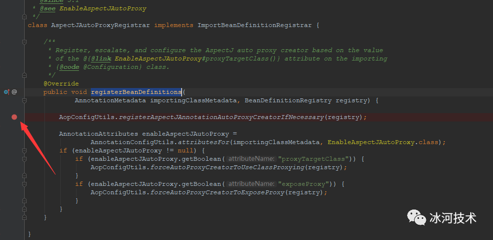 我们在AspectJAutoProxyRegistrar类的registerBeanDefinitions()方法中设置断点,如下所示。