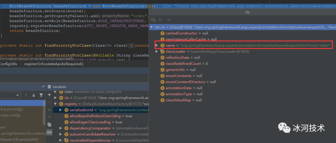 我们可以看到,在registerOrEscalateApcAsRequired()方法中,接收到的Class对象的类型为:org.springframework.aop.aspectj.annotation.AnnotationAwareAspectJAutoProxyCreator。