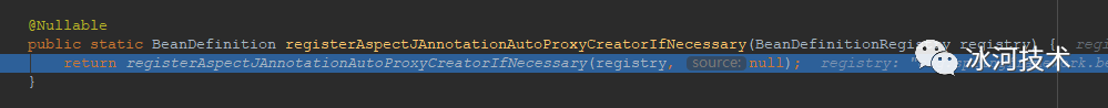 在AspectJAutoProxyRegistrar类的registerBeanDefinitions()方法,首先调用AopConfigUtils类的registerAspectJAnnotationAutoProxyCreatorIfNecessary()方法来注册registry。单看registerAspectJAnnotationAutoProxyCreatorIfNecessary()方法也不难理解,字面含义就是:如果需要的话注册一个AspectJAnnotationAutoProxyCreator。