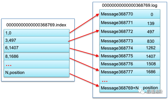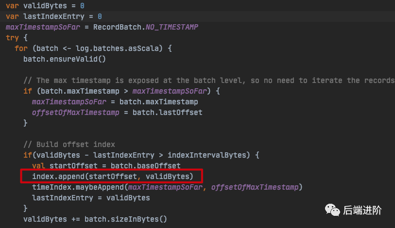 知道相关参数的含义之后,那么这段代码的也就容易解读了:循环读取 log 文件中的消息批次,并读取消息批次中的 baseOffset 以及在 log 文件中物理地址,将其追加到索引文件中,追加的间隔为 indexIntervalBytes 大小。