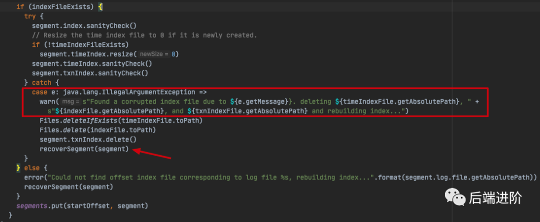 从前一篇文章中已经说到,Kafka 在启动的时候,会检查kafka是否为 cleanshutdown,判断依据为 ${log.dirs} 目录中是否存在 .kafka_cleanshutDown 的文件,如果非正常退出就没有这个文件,接着就需要 recover log 处理,在处理中会调用 。在 recover 前,会调用 sanityCheck() 方法用于检验每个 log sement 的 index 文件,确保索引文件的完整性 ,如果发现索引文件损坏,删除并调用 recoverSegment() 方法进行索引文件的重构,最终会调用 recover() 方法: