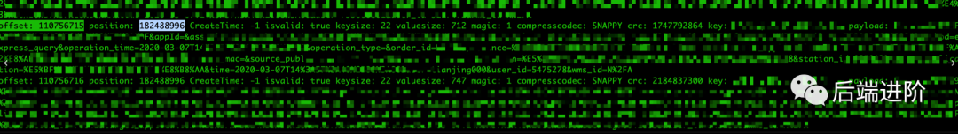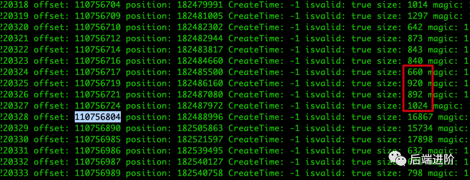 如上图所示,index最后记录的 offset = 110756715,positioin=182484660,与异常栈显示的一样,说明在进行追加下一个索引块的时候,发现下一个索引块的 offset 索引不大于最后一个索引块的 offset,因此不允许追加,报异常并退出进程,那么问题就出现在下一个消息批次的 baseOffset,根据 log.index.interval.bytes 默认值大小为 4 KB(4096),而追加的条件前面也说了,需要大于 log.index.interval.bytes,因此我们 DumpLogSegments 工具查询: