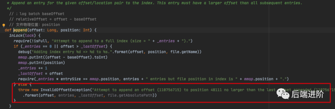 现在也就很好理解了,产生这个异常报错的根本原因,是因为后面的消息批次中,有位移比最后索引位移还要小(或者等于)。