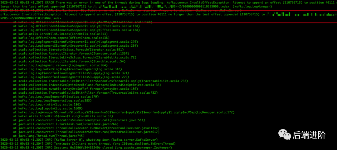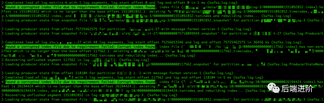 查看了 KafkaServer.log 日志,发现 Kafka 重启过程中,产生了大量如下日志:
