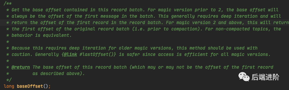 我们再来解读下消息批次中的 baseOffset:我们知道一批消息中,有最开头的消息和末尾消息,所以一个消息批次中,分别有 baseOffset 和 lastOffset,源码注释如下: