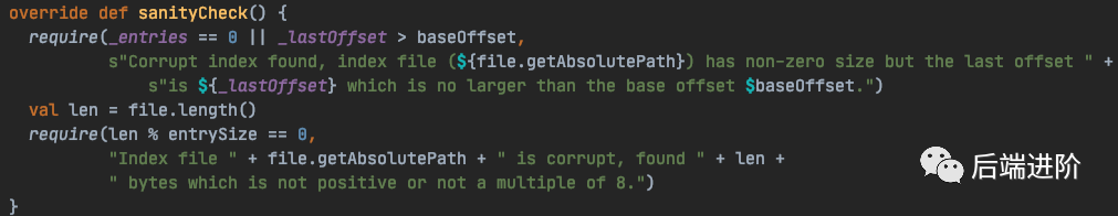 Kafka 在启动的时候,会检查 kafka 是否为 cleanshutdown,判断依据为 ${log.dirs} 目录中是否存在 .kafka_cleanshutDown 的文件,如果非正常退出就没有这个文件,接着就需要 recover log 处理,在处理中会调用 sanityCheck() 方法用于检验每个 log sement 的 index 文件,确保索引文件的完整性: