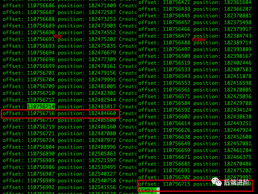 终于找到你了,跟我预测的一样!postion=182488996,在将该消息批次追加到索引文件中,发生 offset 混乱了。