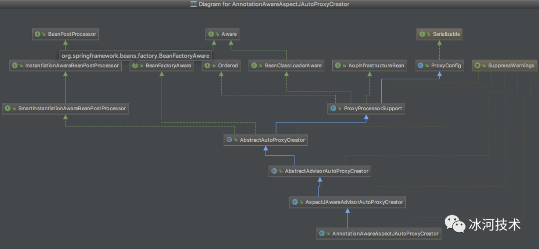 我们先来看下AnnotationAwareAspectJAutoProxyCreator类的结构图。
