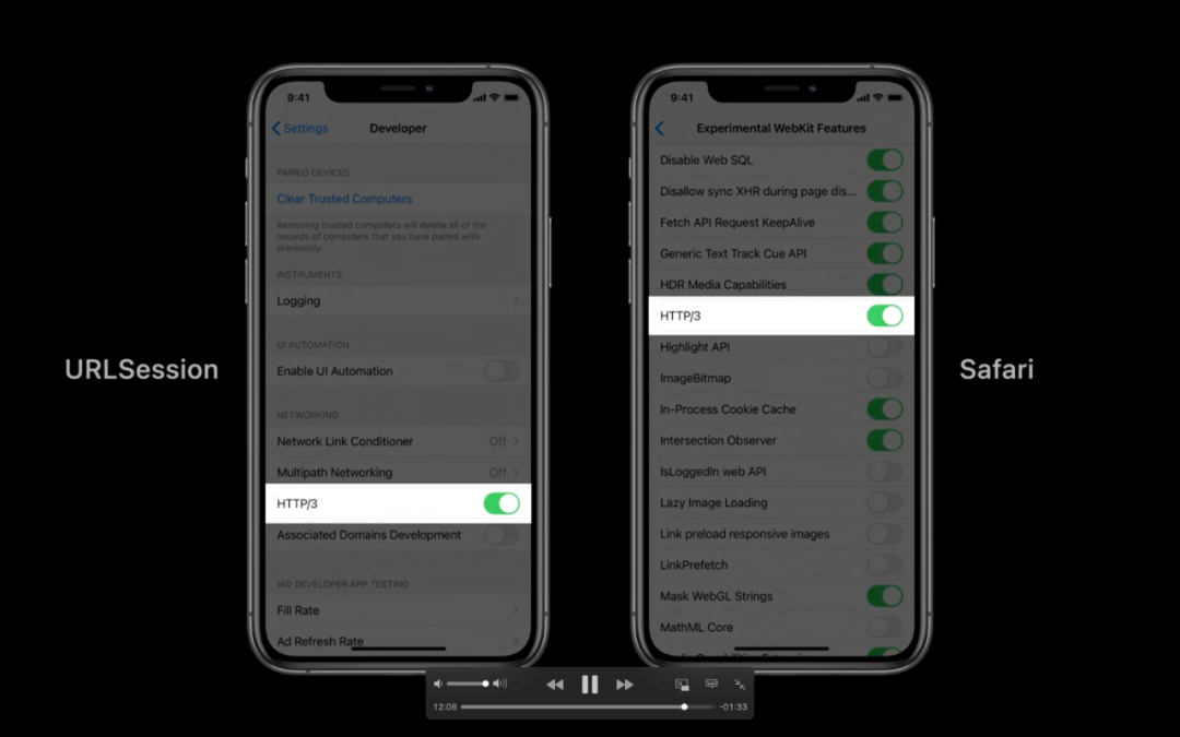 HTTP/3 仍是 IETF 的一项正在进行中的规范,在该规范中,苹果将继续积极协作以帮助使 HTTP/3做好在全球范围内部署的准备。作为朝着这个方向迈出的重要第一步,iOS 14 和 MacOS Big Sur 包括对使用 URLSession的应用程序的 HTTP/3 支持的实验性预览,可以在开发者选项中启用它。