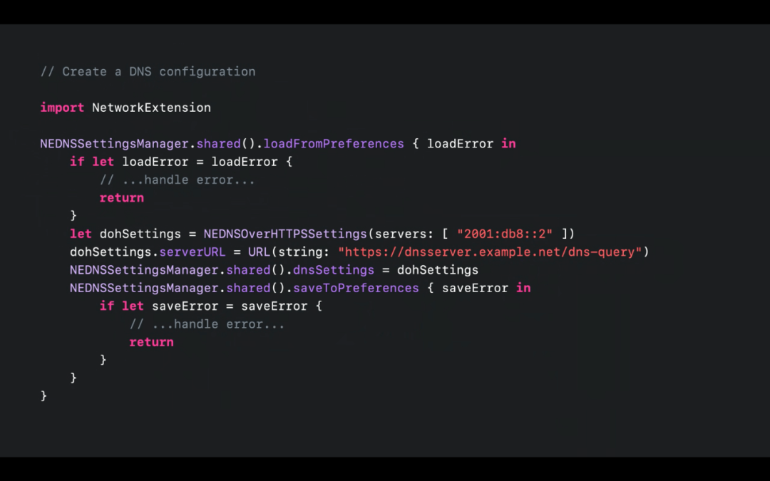 我们可以使用 NEDNSSettingsManager API 编写一个 Network Extension 为加密 DNS 提供系统级的设置。