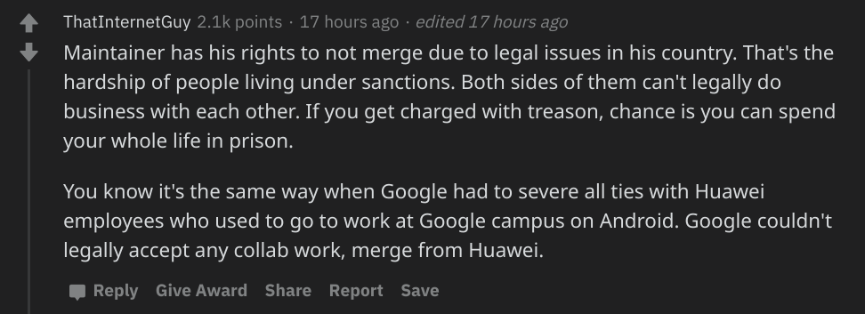 该事件目前已经在 Reddit 上引起热议,评论者从人权、语言、冷战聊到政策对技术/进出口等的影响,其中有人提到了谷歌与华为: