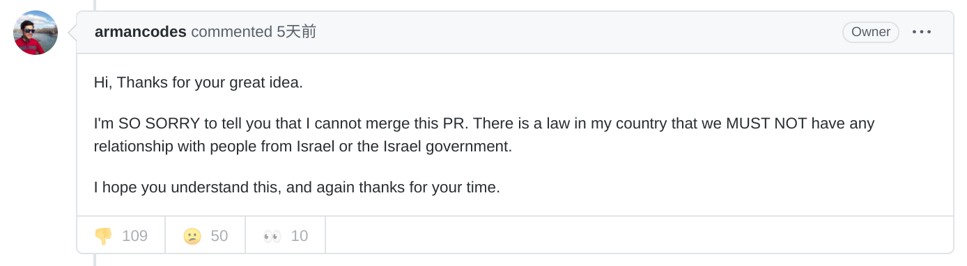 我很抱歉地跟你说我不能合并这一 PR,我们国家有法律规定决不能与以色列人或以色列政府有任何联系。