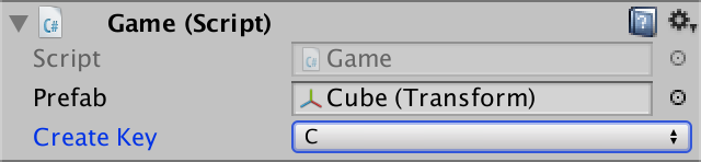 我们将根据玩家的输入生成多维数据集,因此我们的游戏必须能够检测到这一点。我们将使用Unity的输入系统来检测按键。应该使用哪个键来生成多维数据集?C键似乎合适,但是我们可以通过检查器在上添加一个公共KeyCode枚举字段来使其可配置Game。通过分配定义字段时,请使用C作为默认选项。