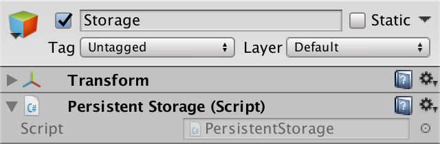附加此组件的场景中添加一个新的游戏对象。它代表了我们游戏的持久存储。从理论上讲,我们可以有多个这样的存储对象,用于存储不同的事物或提供对不同存储类型的访问。但是在本教程中,我们仅使用此单个文件存储对象。