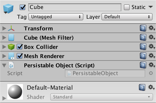 这个想法是,一个只能持久保存的游戏对象只附加了一个组件PersistableObject。具有多个这样的组件是没有意义的。我们可以通过将DisallowMultipleComponent属性添加到类中来强制执行此操作。