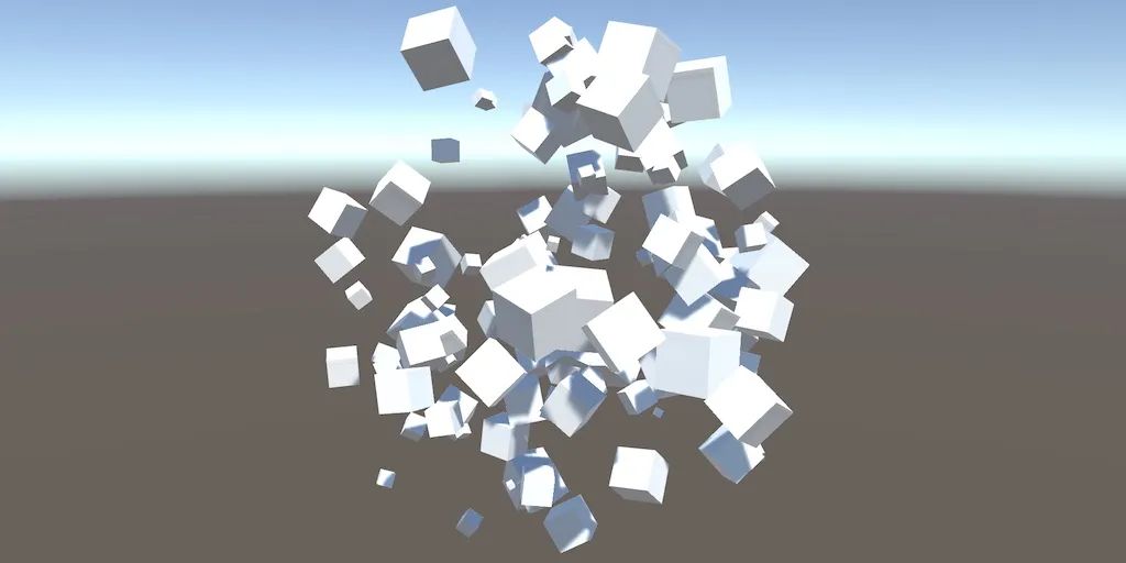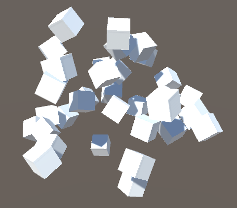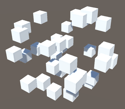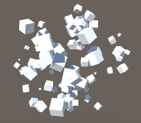 现在,多维数据集在一个球体内部生成,而不是在完全相同的位置生成。它们仍然可以重叠,但这很好。但是,它们都是对齐的,看起来并不有趣。因此,让我们为每个立方体随机旋转,可以使用其静态Random.rotation属性。