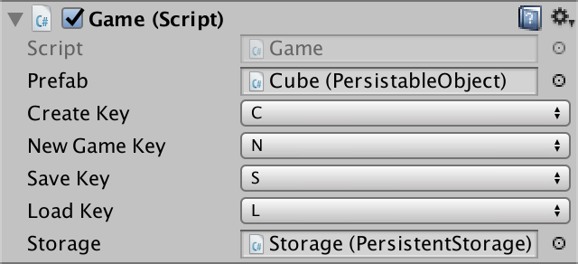 void Update () { if (Input.GetKeyDown(createKey)) { CreateObject(); } else if (Input.GetKeyDown(saveKey)) { storage.Save(this); } else if (Input.GetKeyDown(loadKey)) { BeginNewGame(); storage.Load(this); } }