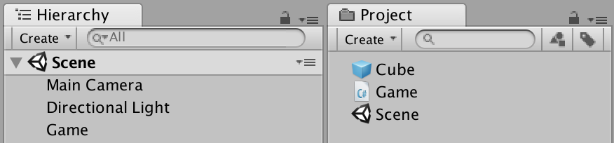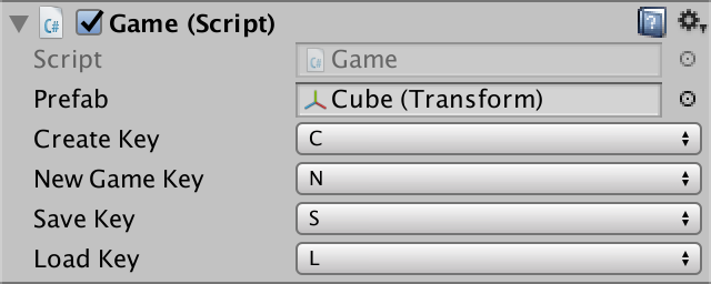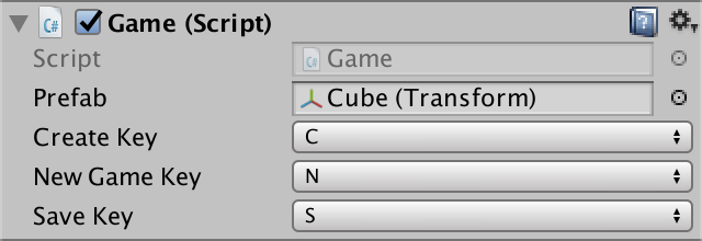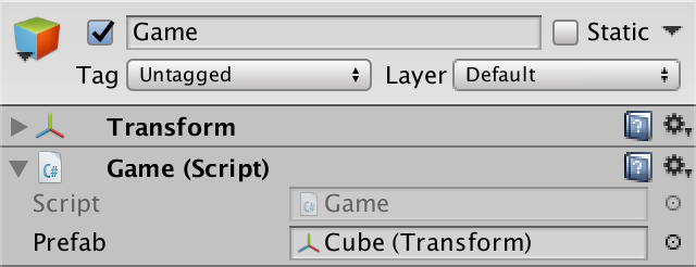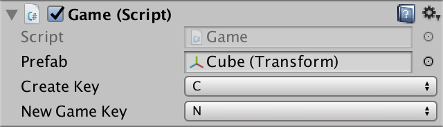 因为我们的游戏非常简单,所以我们将使用单个Game组件脚本来控制它。它将生成多维数据集,为此我们将使用预制对象。因此,它应该包含一个公共字段以连接预制实例。