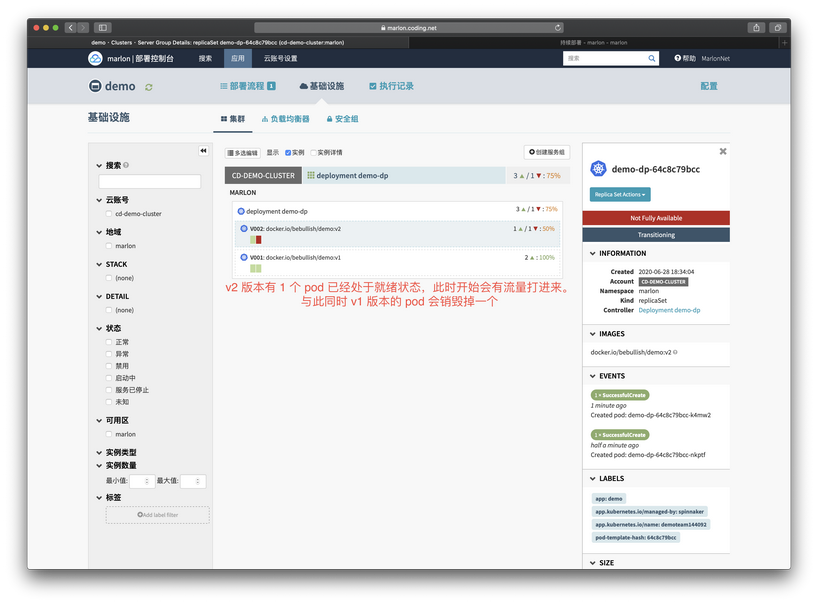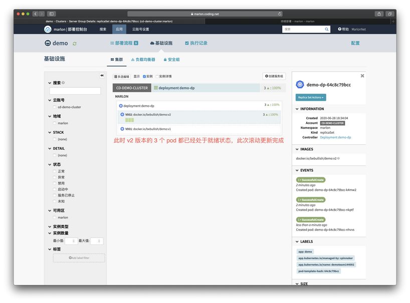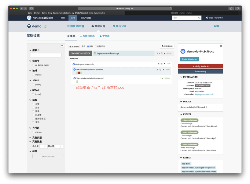 v2 版本的 pod 有两个已经就绪,同时正在启动最后一个新的 pod,与此同时 v1 版本的有两个 pod 已经关机了,而另外一个 pod 仍处于就绪状态。