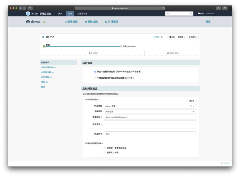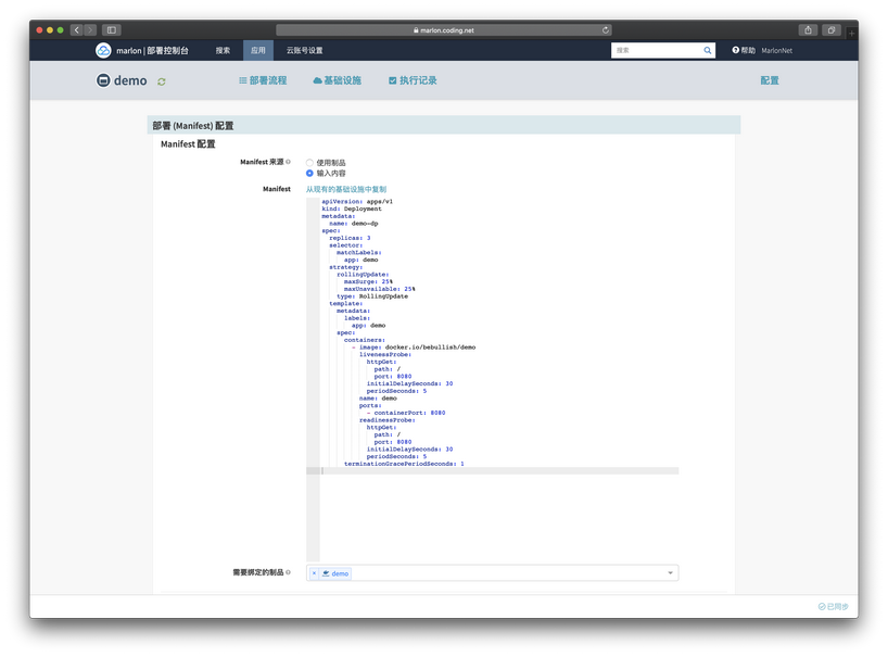 阶段中选择 部署(Manifest) ,输入上述 yaml 文件(主要增加了就绪探针和存活探针),这里需要把镜像的版本删除掉,在需要绑定的制品选择之前配置的制品。这样配置之后,每次执行的时候版本是动态传入的。
