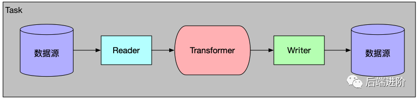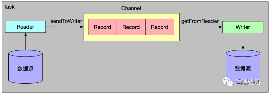 DataX 会单独启动一条线程运行运行一个 Task,而 Task 会持有一个 Channel,用作 Reader 与 Writer 的数据传输媒介,DataX 的数据流向都是按照 Reader—>Channel—>Writer 的方向流转,用如下图表示: