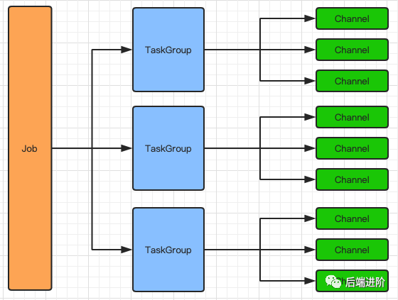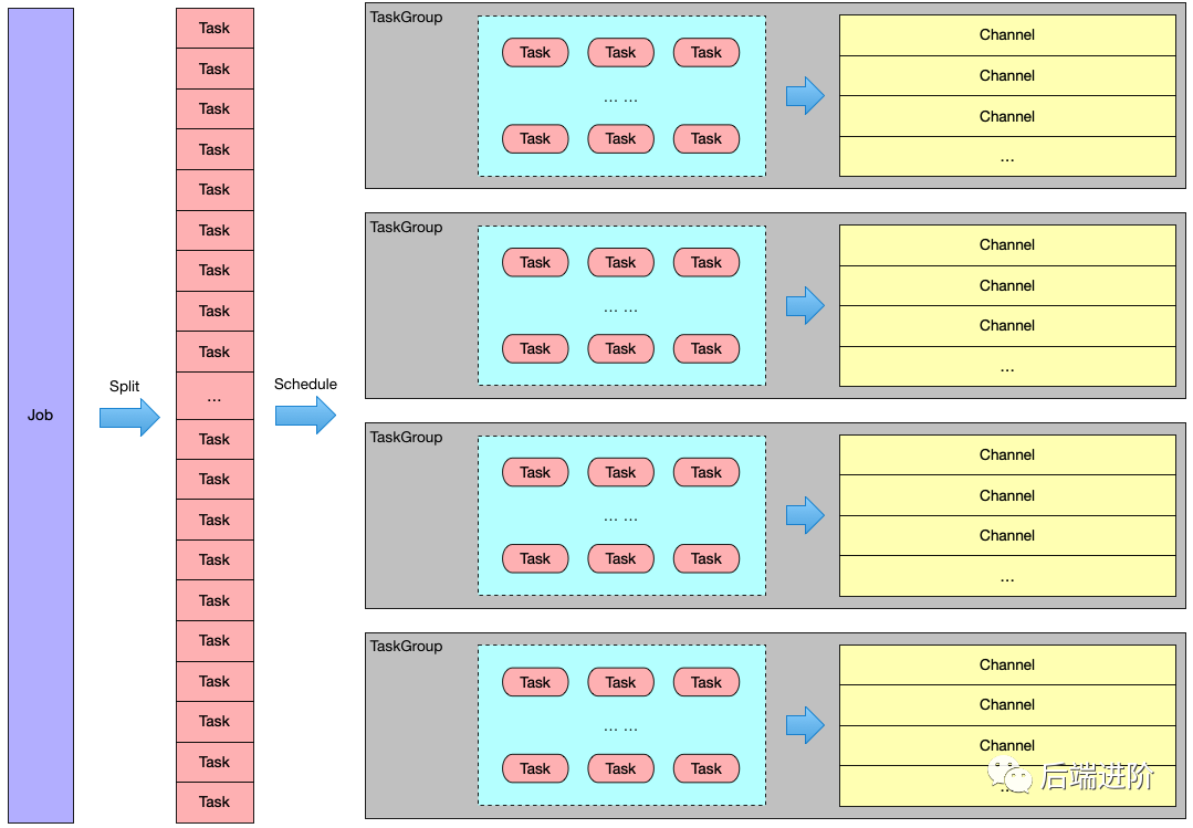 DataX 核心主要由 Job、Task Group、Task、Channel 等概念组成:
