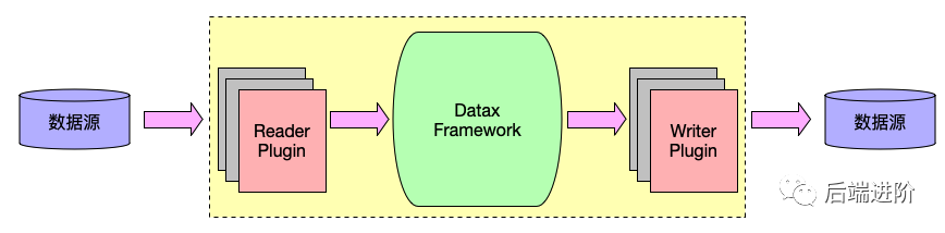 用过 IDEA 的小伙都知道,IDEA 有很多非常棒的插件,用户可根据自身编程需求,下载相关的插件,DataX 也是使用这种可插拔的设计,采用了 Framework + Plugin 的架构设计,如下图所示: