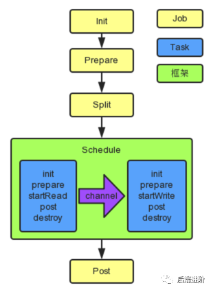 DataX 将用户的 job.json 同步作业配置解析成一个 Job,DataX 通过 JobContainer 完成全局切分、调度、前置语句和后置语句等工作,整体调度流程用如下图表示: