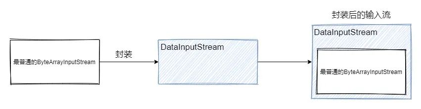上图将 ByteArrayInputStream 封装成 DataInputStream,可以将输入的字节数组转换为对应数据类型的数据。例如希望读入int类型数据,就会以2个字节为单位转换为一个数字。