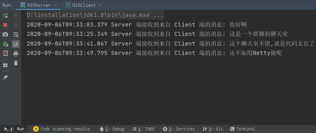 下图可以看见,在客户端给服务器端发送信息,服务器接收到消息后,可以将该条消息分发给其它客户端,就可以实现一个简单的群聊系统,我们还可以给这些客户端贴上标签例如用户姓名,聊天等级······,就可以标识每个客户端啦。在这里由于篇幅原因,我没有写出所有功能,因为使用原生的 NIO 实在是不太便捷。