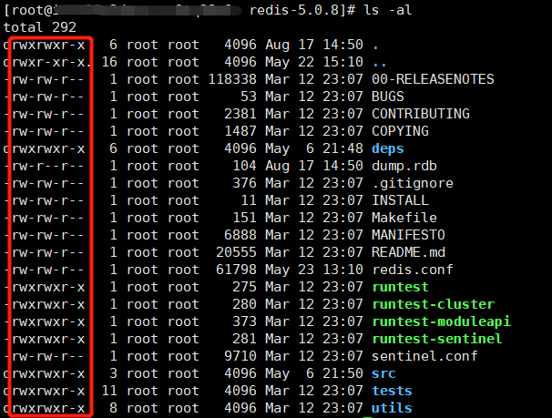 文件的读/写/执行权限,在 Windows 中通常表现不出来,而在 Linux 中可以很好地体现这一点,原因是 Linux 有严格的用户权限分组,不同分组下的用户对文件有不同的操作权限,所以这些方法在 Linux 下会比在 Windows 下更好理解。下图是 redis 文件夹中的一些文件的详细信息,被红框标注的是不同用户的执行权限: