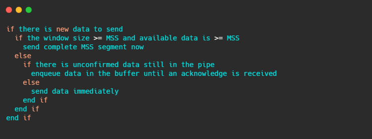 简单的说就是当前能发送的数据和窗口大于等于 MSS 就立即发送,否则再判断一下之前发送的包 ACK 回来没,回来再发,不然就攒数据。