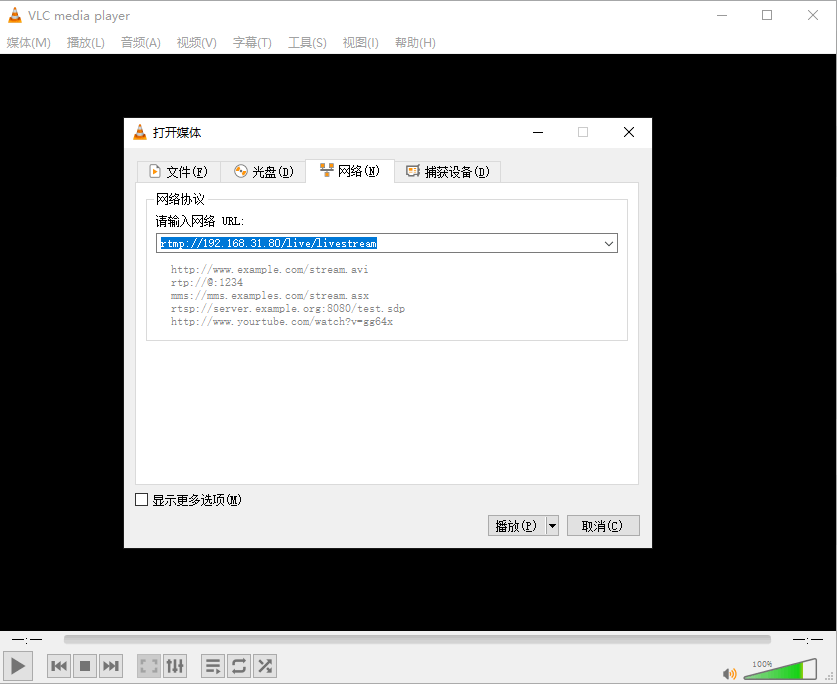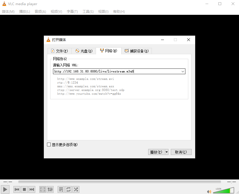 VLC打开网络串流 HLS流地址为 http://192.168.31.80:8080/live/livestream.m3u8