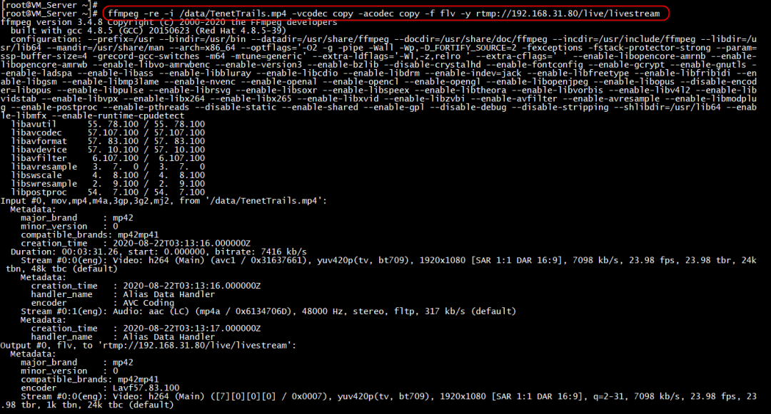 ffmpeg -re -i /data/TenetTrails.mp4 -vcodec copy -acodec copy -f flv -y rtmp://192.168.31.80/live/livestream