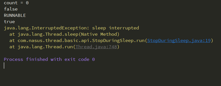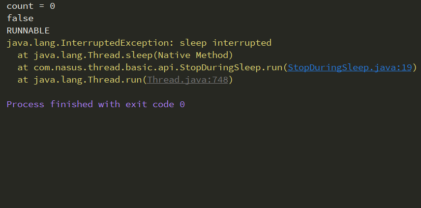 上面讲 sleep 方法时说过, sleep 是可以响应马上中断信号,并清除中断标志位(设置为 false),同时抛出 InterruptedException 异常,退出计时等待状态。看看例子:主线程休眠 5 毫秒后,通知子线程中断,此时子线程仍在执行 sleep 语句,处于休眠中。