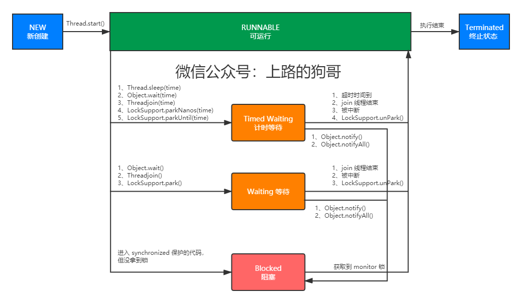 Thread 类中主要有 start、run、sleep、yield、join、interrupt 等方法,其中 start、sleep、yield、join、interrupt(改变 sleep 状态)是会改变线程状态的。最后,上一张完成版的线程状态切换图: