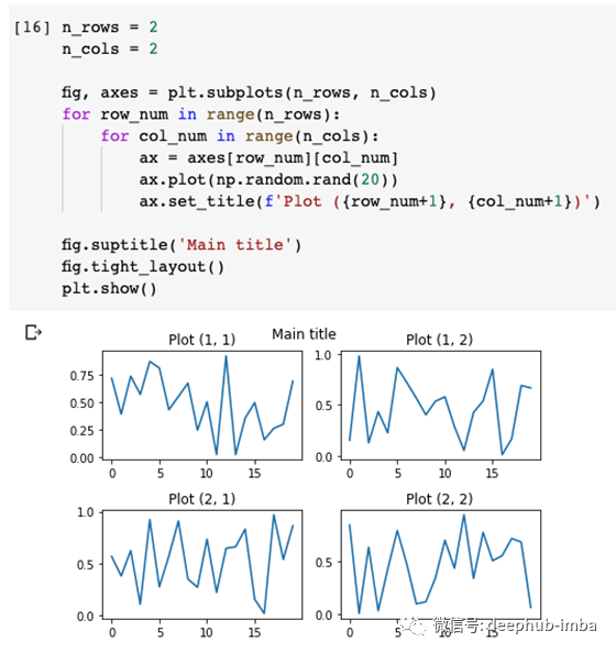 ax.set_title(f'Plot ({row_num+1}, {col_num+1})')fig.suptitle('Main title')